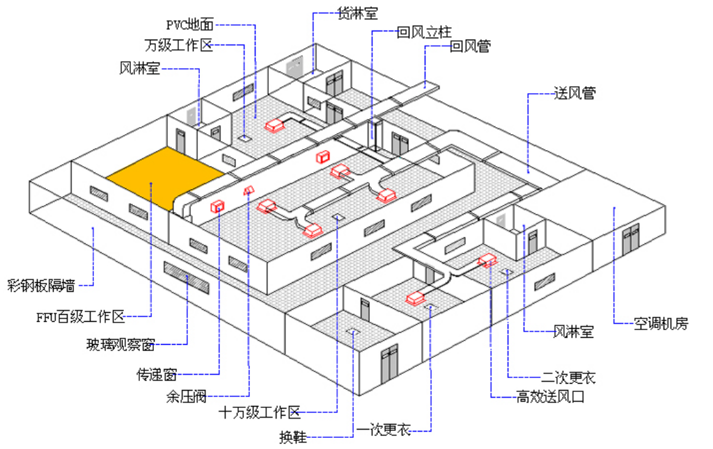 无尘车间也称净化车间,是指将一定空间规范內之空气中的微粒子、有害空气、细菌等之污染物排除,並將室內之温度、洁净度、室內压力、气流速度与气流分布、噪音振动及照明、靜电控制在某一需求范围內,而所給予特別设计之房间。无尘车间亦即是不论外在之空气条件如何变化,其室內均能俱有维持原先所设定要求之洁净度、温湿度及压力等性能之特性。无尘车间最主要之作用在于控制厂品(如硅芯片等)所接觸之大氣气的洁净度日及温湿度,使...
